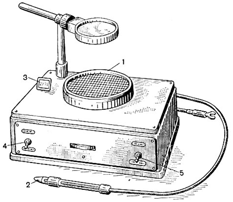 Прибор для счета колоний микроорганизмов. 1 - столик для чашки Петри; 2 - игла с пружинным устройством; 3 - показатель счетчика; 4 - тумблер для включения импульсного счетчика; 5 - тумблер для включения лампы освещения счетчика