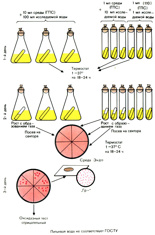 Исследуемую воду засевают по 100 мл в 3 колбы, по 10 мл в 3 пробирки (с концентрированной средой) и по 1 мл в 3 пробирки (со средой нормальной концентрации) - всего 333 мл. Посевы инкубируют в термостате при 37° С 24 ч.