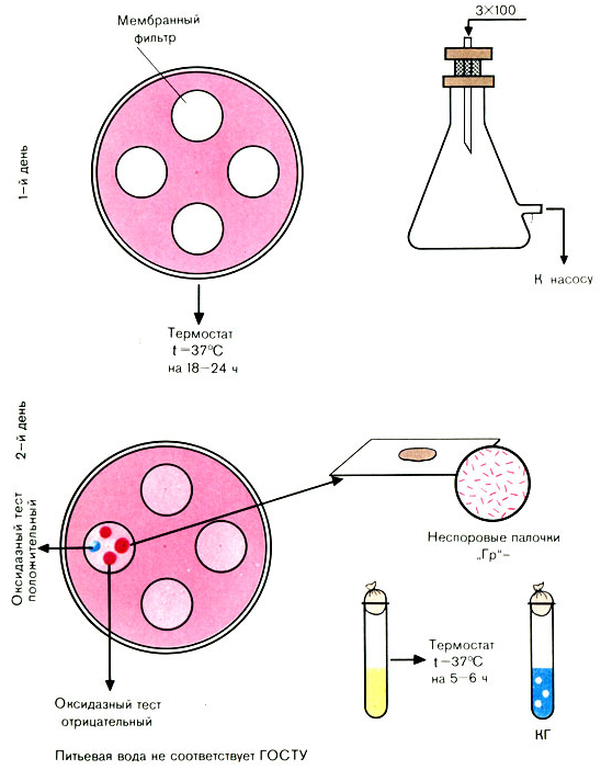 Примечание. Титрационный метод более точный и может быть использован при наличии в воде примесей. Метод мембранных фильтров экономичнее и дает возможность дать ответ на 2-й день.