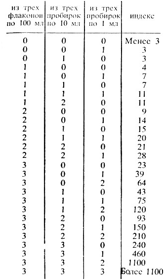 Отрицательная проба на оксидазу свидетельствует о наличии в воде БГКП. В этом случае вычисляют коли-индекс и коли-титр с помощью стандартных (эмпирических) таблиц ГОСТа 16963-73.