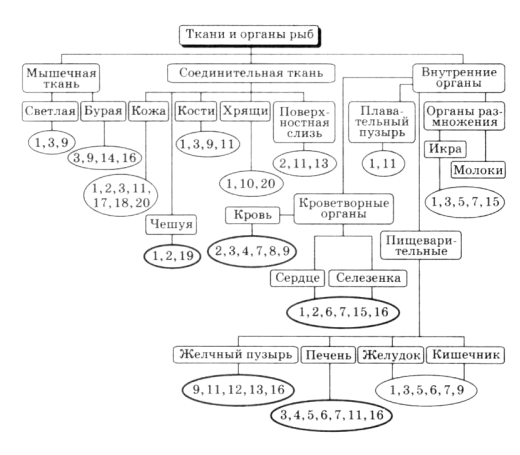Рисунок 1.2 Характеристика тканей и органов рыб по содержанию БАВ: 1 белки; 2 аминокислоты; 3 липиды; 4 жирные кислоты; 5 полиненасыщенные жирные кислоты; 6 витамины; 7 ферменты; 8 гормоны; 9 минеральные вещества; 10 хондроитинсульфат; 11 гликопротеиды; 12 желчные кислоты; 13 холестерин; 14 ДНК; 15 фосфолипиды; 16 гликоген; 17 каротиноиды; 18 меланиновые пигменты; 19 гуанин; 20 гексозамины.