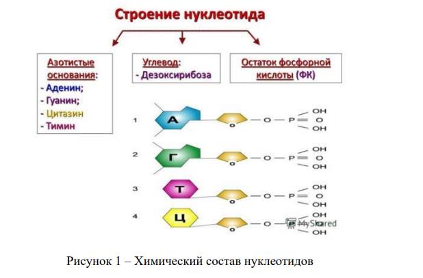 Основы классической генетики были заложены в середине XIX века благодаря экспериментам чешско-австрийского биолога Грегора Менделя. Открытые им на примере растений принципы передачи наследственных признаков от родительских организмов к их потомкам в 1865 году, к сожалению, не получили должного внимания у современников, и только в 1900 году Хуго де Фриз и другие европейские ученые независимо друг от друга «переоткрыли» законы наследственности. Параллельно с этим шел процесс формирования знаний о ДНК. Так, в 1869 году швейцарский биолог Фридрих Мишер открыл факт существования макромолекулы, а в 1910 году американский биолог Томас Хант Морган обнаружил на основе характера наследования мутаций у дрозофил, что гены расположены линейно на хромосомах и образуют группы сцепления. В первой половине двадцатого столетия ученым удалось выяснить строение основных органелл клетки, в том числе строение молекулы ДНК, которая представляла собой последовательность нуклеотидов, в состав которых входят четыре азотистых основания, дезоксирибоза и остаток фосфорной кислоты (рисунок 1).