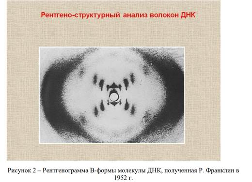 Розалинд Франклин и Морис Уилкинс в Кембриджском университете занимались рентгеноструктурными анализами молекулы ДНК. Сделанные Р. Франклин снимки со структурой молекулы (рисунок 2) послужили основой для дальнейших исследований Джона Уотсона и Фрэнсиса Крика, которые в 1953 году сделали открытие о молекулярной структуре молекулы ДНК.